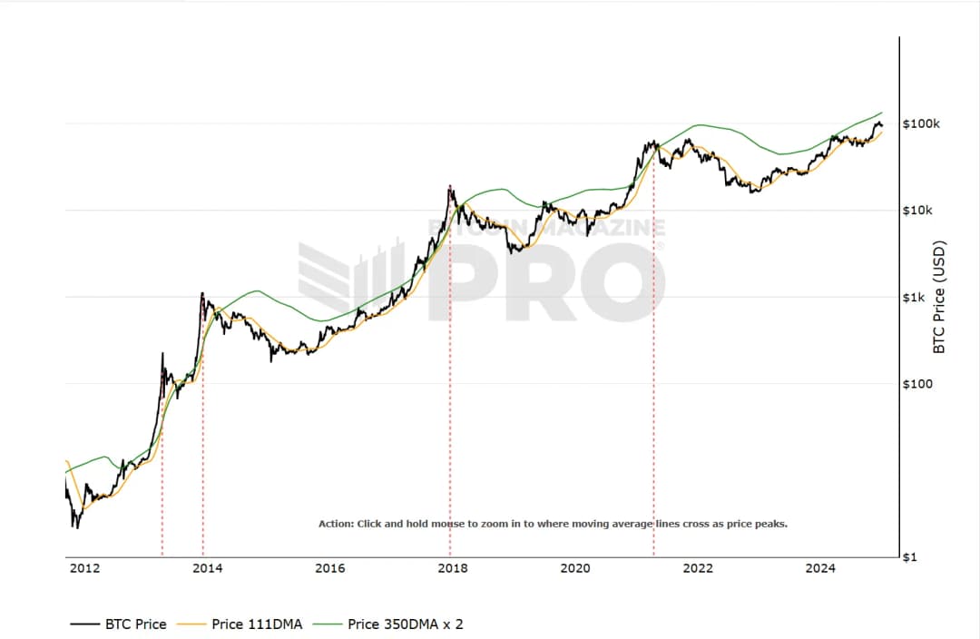 این شاخص بهطور دقیق اوجهای محلی و چرخههای بازار قبلی را مشخص کرده است. در واقع، اوجهای مارس و دسامبر ۲۰۲۴ زمانی رخ داد که این شاخص به ۲ رسید. در بیشتر موارد، افزایش به ۴ نشاندهنده اوج چرخه بود. در زمان نگارش این مطلب، این شاخص به ۱.۷ کاهش یافته و از ۴ فاصله زیادی دارد که نشان میدهد اوج چرخه بیت کوین نزدیک نیست. شاخص دیگری به نام Pi Cycle Top نیز از فعال شدن این اوج بازار فاصله دارد. این شاخص اوجهای قبلی بازار را زمانی که میانگین متحرک ۱۱۱ روزه از میانگین متحرک ۳۵۰ روزه اصلاحشده عبور میکرد، نشان میداد.