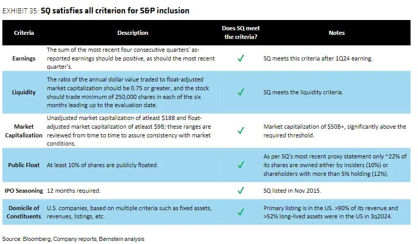 سیگل افزود که Block پس از سهماهه اول ۲۰۲۴ معیارهای سودآوری را محقق کرد، اما تأکید کرد که «اضافه شدن به S&P 500 بهصورت صرفاً فرمولی نیست و به صلاحدید کمیته شاخص تعیین میشود.» بهطور تاریخی، شرکتهایی که تمام الزامات را رعایت کردهاند، ظرف سه تا ۲۱ ماه اضافه شدهاند.