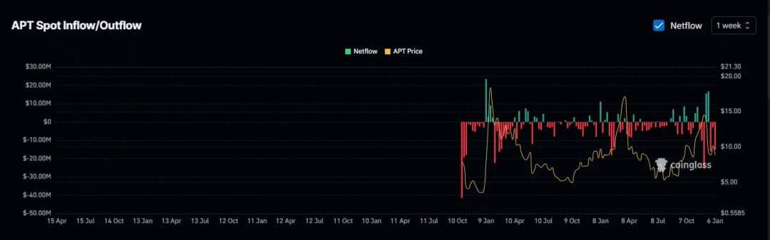 در حالی که این معیارها به تنهایی جهت قیمت APT را به طور قطعی نشان نمیدهند، تحلیل بیشتر روندهای معاملات مشتقه و اسپات نشاندهنده پتانسیل بازیابی قیمت است. معاملهگران بازار اسپات و مشتقه فعالیتهای خرید خود را افزایش دادهاند که نشاندهنده تغییر احساسات به سمت APT است. در زمان نگارش این مطلب، خروجی APT از صرافیها به طور قابل توجهی افزایش یافته است. در هفت روز گذشته، جریان خالص APT در صرافیها به منفی ۱۵.۰۵ میلیون دلار رسید که نسبت به ۲.۵۹ میلیون دلار هفته قبل افزایش چشمگیری داشته است.