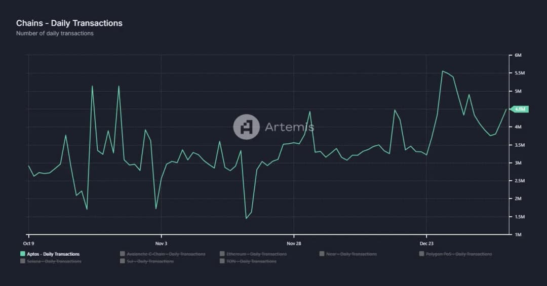 دادههای اخیر Artemis نشاندهنده افزایش معیارهای کلیدی برای APT است که میتواند بر مسیر قیمت آن در روزهای آینده تأثیر بگذارد. این گزارش نشان میدهد که تعداد آدرسهای فعال روزانه در بلاکچین آپتوس به ۱.۲ میلیون رسیده که نشاندهنده افزایش فعالیت شبکه است. علاوه بر این، حجم تراکنشهای روزانه به شدت افزایش یافته و ۴.۵ میلیون تراکنش در ۲۴ ساعت ثبت شده است. این تراکنشها شامل فعالیتهای خرید و فروش بوده و نشاندهنده مشارکت بالای بازار است.