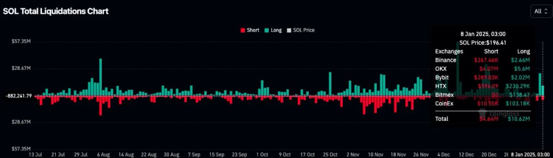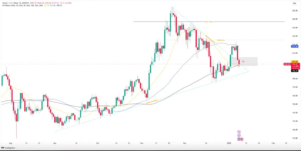 همگرایی میانگینهای متحرک نشاندهنده احتمال افزایش نوسانات است. معاملهگران در حال بررسی این هستند که آیا SOL میتواند ۲۰۰ دلار را پس بگیرد و به سمت مقاومت ۲۲۰ دلار حرکت کند یا خیر. ادامه روند نزولی میتواند سطوح حمایت پایینتر را بیشتر آزمایش کند و عدم قطعیت را در بازار افزایش دهد.