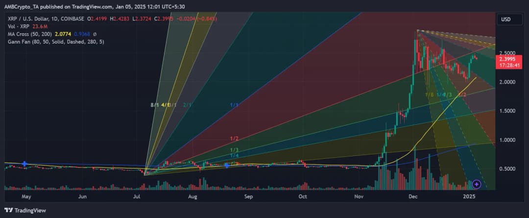 از نظر مقاومت، فن گن و پیشبینیهای فیبوناچی، ۲.۵۰ دلار را به عنوان یک مانع کلیدی نشان میدهند. عبور از این سطح میتواند راه را برای XRP به سمت هدف ۳.۰۰ دلار هموار کند، در حالی که عدم حفظ حمایت ۲.۰۰ دلاری ممکن است منجر به اصلاح عمیقتر شود.