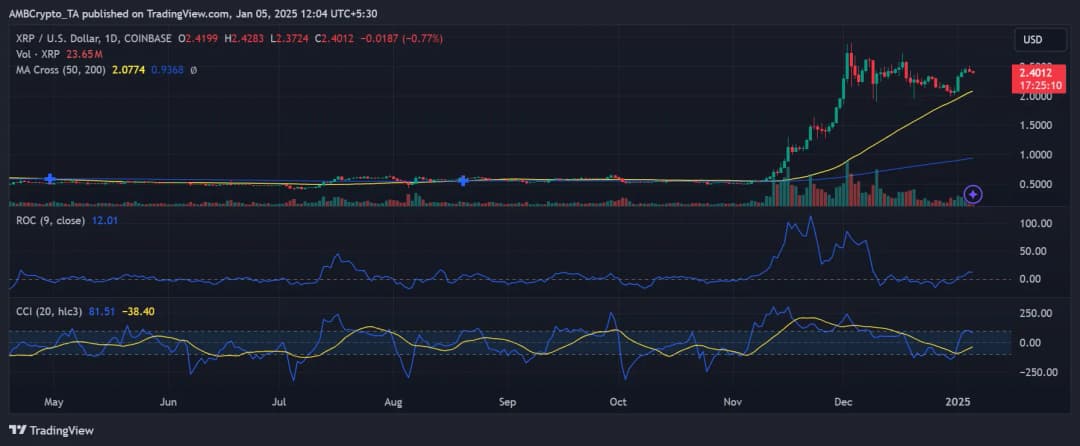 XRP در زمان نگارش این مطلب با قیمت تقریباً ۲.۴ دلار معامله میشد که نشاندهنده یک اصلاح جزئی از اوجهای اخیر است. این ارز دیجیتال در یک مرحله تثبیت حیاتی قرار دارد و مسیر آینده آن به شاخصهای تکنیکال کلیدی بستگی دارد. شاخص کانال کالا (CCI) که در نمودارها نمایش داده شده، شرایط اشباع خرید را با مقدار ۱۰۱.۷۷ نشان میدهد. این موضوع حاکی از آن است که XRP ممکن است با فشار فروش کوتاهمدت مواجه شود. با این حال، باید توجه داشت که وضعیت اشباع خرید همیشه به معنای اصلاح فوری نیست، به ویژه در طول یک روند صعودی قوی.