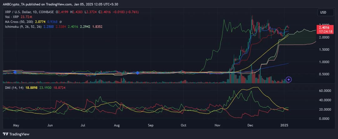 شاخصهای روند XRP زمینه مهمی را فراهم میکنند. نمودارها نشان میدهند که میانگین متحرک ساده ۵۰ روزه (SMA) بالاتر از میانگین متحرک ۲۰۰ روزه باقی مانده است که نشاندهنده تداوم روند صعودی در بلندمدت است. ابر ایچیموکو نیز این دیدگاه را تأیید میکند، زیرا XRP بالاتر از ابر معامله میشود. این موقعیت، حرکت صعودی توکن را تأیید میکند و خطوط پیشرو نشاندهنده حمایت قوی در سطح ۲.۰۰ دلار هستند.
