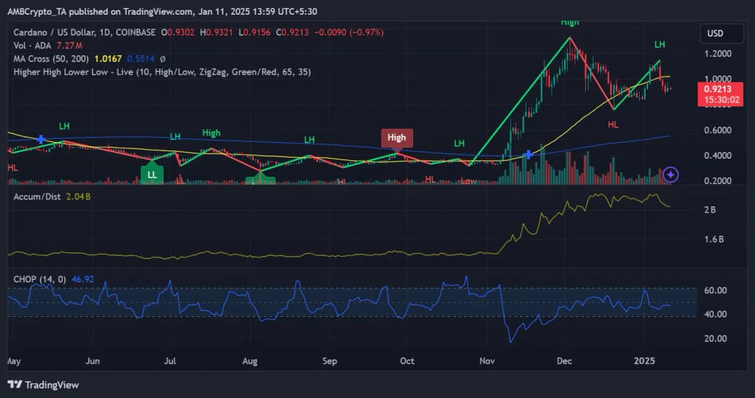 خط انباشت/توزیع (A/D) نشاندهنده علاقه کم خریداران است که با کاهش حجم معاملات همبستگی دارد. علاوه بر این، شاخص Choppiness (CHOP) نشان میدهد که حرکت قیمت ADA همچنان در محدوده خاصی قرار دارد و فاقد شتاب قطعی است که این ویژگی معمول بازارهای در حال تثبیت است. سطوح کلیدی که باید زیر نظر داشت شامل ۰.۹۰ دلار به عنوان حمایت فوری و ۱.۰۰ دلار به عنوان مقاومت هستند. عدم حفظ قیمت بالاتر از منطقه حمایت میتواند منجر به فشار نزولی بیشتر شود.