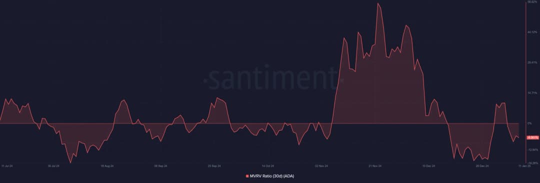 نسبت MVRV (ارزش بازار به ارزش تحققیافته) ۳۰ روزه، که سودآوری دارندگان کوتاهمدت را نشان میدهد، در زمان نگارش این مطلب منفی و برابر با ۶.۹۰٪- بود. این موضوع نشان میدهد که کاردانو در حال حاضر در مرحله کمارزشگذاری قرار دارد و دارندگان متوسط آن با زیانهای تحققنیافته مواجه هستند. به طور تاریخی، چنین سطوحی گاهی اوقات قبل از یک بازگشت روند رخ دادهاند، اگرچه این موضوع همیشه تضمینی نیست.