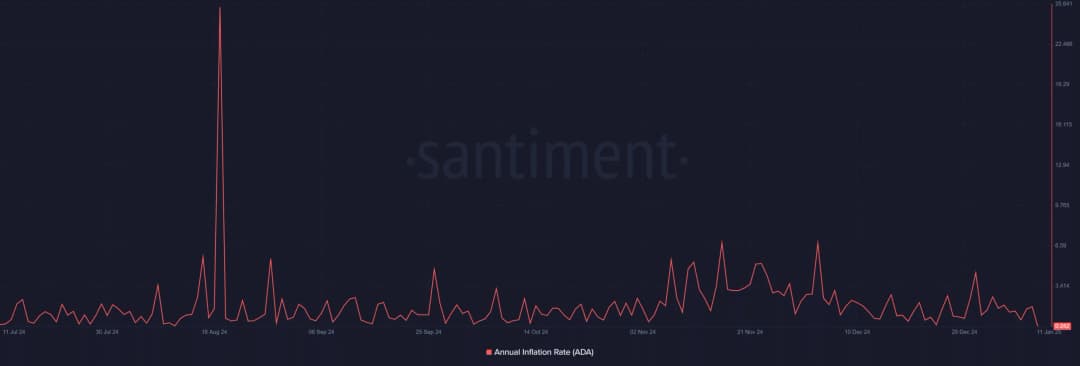 این دادهها نشان میدهد که در حالی که ADA میتواند فرصتی برای انباشت باشد، شرایط کلی بازار ممکن است بهبود فوری را به تأخیر بیندازد. بهبود پایدار در احساسات بازار و ثبات قیمت ADA احتمالاً تعیین میکند که آیا افزایش قابل توجهی رخ خواهد داد یا خیر. نرخ تورم سالانه کاردانو با ۰.۲۴۲٪ نسبتاً پایین باقی مانده است که ویژگیهای ضد تورمی شبکه و جذابیت آن برای دارندگان بلندمدت را نشان میدهد. در مقایسه با سایر شبکههای بلاکچین، این رقم توانایی ADA در کاهش رشد بیش از حد عرضه توکن را نشان میدهد و از ارزش آن حمایت میکند.