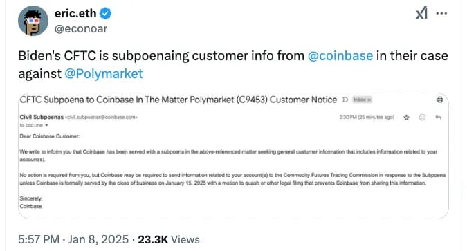گزارشها حاکی از آن است که صرافی ارز دیجیتال کوینبیس، که در ایالات متحده مستقر است، با احضاریهای از سوی کمیسیون معاملات آتی کالای ایالات متحده (CFTC) در ارتباط با پلتفرم بازار پیشبینی مبتنی بر کریپتو یعنی Polymarket مواجه شده است. طبق گزارشها، کوینبیس در ۸ ژانویه در اطلاعیهای به مشتریان خود اعلام کرد که CFTC احضاریهای را در رابطه با Polymarket به آنها ابلاغ کرده است. این خبر توسط اریک کانر، یکی از بنیانگذاران EthHub، در یک پست شبکه اجتماعی X در روز چهارشنبه منتشر شد.