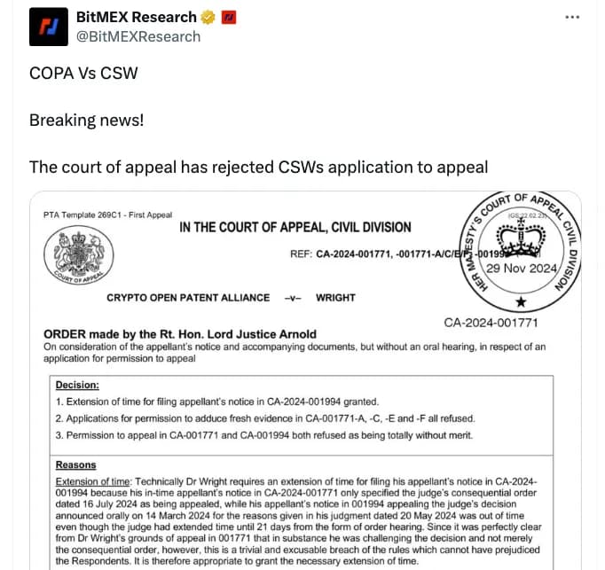 دادگاه تجدیدنظر بریتانیا، تلاش کریگ رایت برای تجدیدنظر در حکم دادگاه عالی که اعلام کرده بود او ساتوشی ناکاموتو، خالق مستعار بیت کوین، نیست را رد کرد. هودلنات، یکی از فعالان بیت کوین که به طور گسترده ماجرای «فیکتوشی» رایت را پوشش میدهد، در ۲۹ نوامبر در شبکه اجتماعی X گزارش داد که درخواست رایت برای تجدیدنظر «به شدت رد شده است». به گفته دادگاه، رایت استدلالهای نادرستی برای اثبات اینکه ناکاموتو است ارائه کرده بود، از جمله مواردی که مشکوک به تولید توسط هوش مصنوعی بودند.