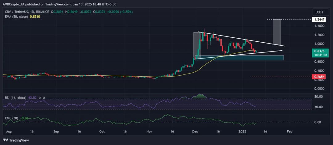 این گزارش به ویژگیهای جدید محصولات و علاقه مؤسسات به عنوان عوامل کلیدی رشد کاربران اشاره کرده است. در واقع، در اواخر نوامبر، بلک راک Curve را برای نقدینگی و معاملات دارایی توکنیزه شده خود یعنی BUIDL انتخاب کرد. این موضوع نشاندهنده علاقه مؤسسات به این صرافی غیرمتمرکز است که در نمودارهای قیمتی نیز مشهود بوده است. علیرغم احساسات ضعیف بازار در زمان نگارش این گزارش، CRV همچنان حدود ۲۸۰ درصد از رشد ثبت شده در جریان افزایش قیمت نوامبر را حفظ کرده است. اصلاح قیمت اخیر در منطقه تقاضای ۰.۶ تا ۰.۷ دلار (آبی) متوقف شد و حرکت قیمت یک الگوی مثلثی را تشکیل داد. یک بریک اوت صعودی از این الگو میتواند هدف ۱.۵ دلاری را ممکن کند، اما یک بریک اوت نزولی میتواند باعث از بین رفتن بیشتر رشد نوامبر و کاهش قیمت به ۰.۲۶ دلار شود.