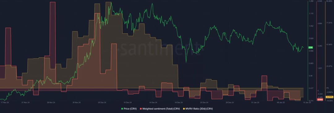 با این حال، احساسات ضعیف و MVRV (ارزش بازار به ارزش تحققیافته) ۳۰ روزه منفی نشان میدهد که CRV در قیمت فعلی نسبتاً ارزان است. MVRV ۳۰ روزه ۱۰٪ کاهش یافته در حالی که MVRV ۶۰ روزه با ۱۲٪ مثبت است. این موضوع نشان میدهد که کسانی که این کوین را در یک و دو ماه گذشته خریدهاند، به طور متوسط به ترتیب ۱۰٪ ضرر تحققنیافته و ۱۲٪ سود تحققنیافته دارند.