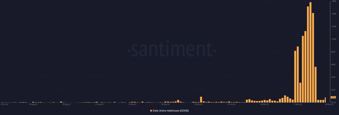 علاوه بر این، تعداد آدرسهای فعال روزانه دوج کوین از ۸۲.۷ هزار به ۱۲۲.۸۴ هزار در یک روز افزایش یافته است که نشاندهنده افزایش ۴۸ درصدی است. این افزایش شدید نشاندهنده مشارکت بیشتر کاربران در شبکه است که اغلب یک سیگنال صعودی محسوب میشود. آدرسهای فعال بیشتر معمولاً نشاندهنده علاقه بیشتر سرمایهگذاران است که میتواند به افزایش قیمت منجر شود. بنابراین، این افزایش در آدرسهای فعال میتواند نشانهای از جلب توجه سرمایهگذاران به دوج کوین باشد.