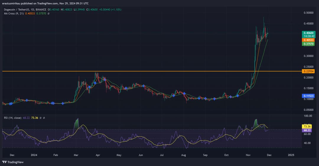 با نگاهی به شاخصهای تکنیکال، دوج کوین علائم امیدوارکنندهای نشان میدهد، اگرچه همچنان باید با احتیاط عمل کرد. شاخص قدرت نسبی (RSI) در حال حاضر ۶۸.۲۲ است که کمی پایینتر از سطح اشباع خرید ۷۰ قرار دارد. این نشان میدهد که دوج کوین در موقعیت قوی قرار دارد اما به محدوده اشباع خرید نزدیک میشود. اگر فشار خرید ادامه پیدا نکند، ممکن است یک اصلاح کوتاهمدت در پیش باشد. از سوی دیگر، میانگین متحرک نمایی ۹ روزه بالاتر از میانگین متحرک نمایی ۲۱ روزه است که نشانه صعودی برای حرکت کوتاهمدت است. با این حال، هنوز هیچ تقاطع تایید شدهای رخ نداده است، به این معنی که معاملهگران همچنان منتظر تایید قبل از ورود کامل به بازار هستند. بنابراین، در حالی که وضعیت تکنیکال امیدوارکننده است، بازار همچنان محتاط باقی میماند.