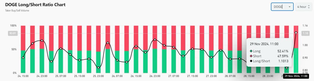 نسبت معاملات لانگ به شورت برای DOGE در حال حاضر ۵۲.۴۱٪ لانگ و ۴۷.۵۹٪ شورت است که نسبت لانگ/شورت ۱.۱۰۱۳ را ایجاد میکند. این تمایل صعودی جزئی نشان میدهد که معاملهگران بیشتری روی افزایش قیمت شرطبندی میکنند. با این حال، نزدیکی این نسبت نشان میدهد که بازار همچنان نامطمئن است و هم گاوها و هم خرسها منتظر سیگنالهای واضحتر هستند.