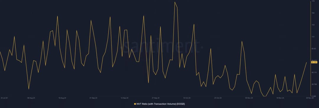 نسبت ارزش شبکه به تراکنشها (NVT) در ۲۴ ساعت گذشته از ۵۱.۹۳ به ۶۶.۵۷ افزایش یافته است. این افزایش نشان میدهد که حجم تراکنشها نسبت به ارزش بازار دوج کوین در حال افزایش است که معمولاً نشاندهنده فعالیت رو به رشد بازار است. نسبتهای NVT بالاتر اغلب با افزایش قیمتها همبستگی دارند، زیرا سرمایه بیشتری از طریق شبکه جریان پیدا میکند. با این حال، از آنجا که افزایش NVT نسبتاً جزئی است، معاملهگران باید منتظر رشد پایدارتر حجم تراکنشها باشند تا انتظار تغییر قابل توجهی در قیمت را داشته باشند.