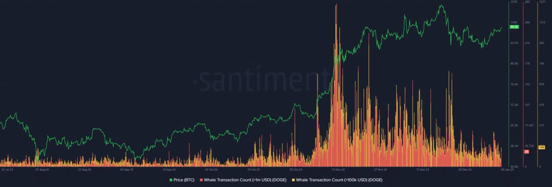 افزایش اخیر قیمت دوج کوین به نظر میرسد تحت تأثیر فعالیت شدید نهنگها باشد. دادههای Santiment نشان میدهد که در ۲۴ ساعت گذشته، تراکنشهای بزرگ بالای ۱۰۰ هزار دلار، افزایش چشمگیر ۴۰۰ درصدی داشته است که نشاندهنده علاقه فزاینده سرمایهگذاران ثروتمند است.