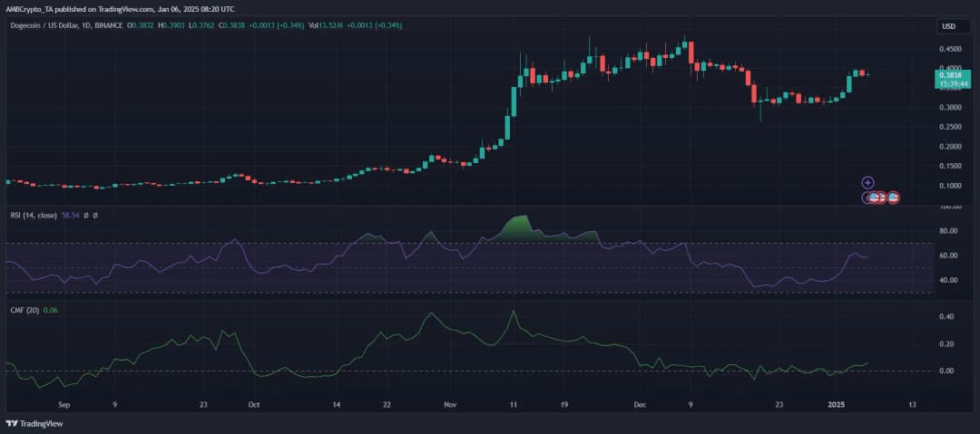 حرکت قیمتی اخیر دوج کوین، آن را به عنوان یک گزینه قوی برای تداوم صعود در کوتاهمدت مطرح کرده است. دادهها نشاندهنده یک شکست واضح از فاز تثبیت است که با افزایش مستمر حجم معاملات و نقدینگی پشتیبانی میشود. با قرار داشتن شاخص CMF در محدوده مثبت ۰.۰۶، جریانهای ورودی سرمایه نشاندهنده فشار خرید پایدار و تقاضای قوی در بازار است. علاوه بر این، RSI همچنان زیر محدوده اشباع خرید قرار دارد که نشان میدهد بدون ریسک فوری اصلاح، فضای بیشتری برای صعود وجود دارد. این همگرایی تکنیکال، همراه با فعالیت قوی نهنگها، احساسات صعودی کوتاهمدت را تقویت میکند.
