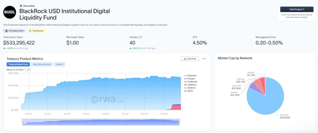 BUIDL که توسط Securitize توکنی شده است، یک صندوق بازار پول است که عمدتاً در اوراق خزانهداری کوتاهمدت ایالات متحده و اوراق بهادار کمریسک و بهرهدار مشابه سرمایهگذاری میکند. BUIDL از نظر داراییهای تحت مدیریت (AUM) بزرگترین صندوق خزانهداری توکنی شده است و پس از آن صندوق Franklin OnChain US Government Money Fund (FOBXX) با AUM تقریباً ۵۴۰ میلیون دلار و ۴۵۰ میلیون دلار قرار دارد.