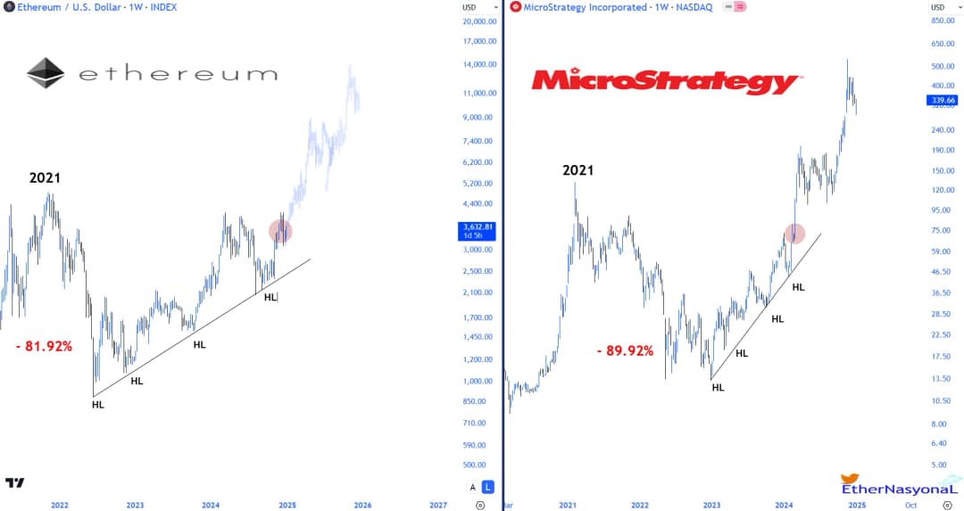 حرکت قیمت اتریوم (ETH) همراه با عملکرد سهام MicroStrategy از ۲۰۲۱ تا ۲۰۲۵ الگوی مشابهی را نشان میدهد که میتواند به رشد قابل توجه ETH اشاره داشته باشد. در ۲۰۲۱، قیمت ETH ۸۱.۹۲٪ کاهش یافت که مشابه افت ۸۹.۹۲٪ MicroStrategy در همان دوره بود. با این حال، هر دو نمودار فاز بازیابی را نشان دادند که در آن کفهای بالاتر، اعتماد سرمایهگذاران را تقویت میکرد. اتریوم از پایینترین نقطه خود، تثبیت و روند صعودی را نشان داد و اخیراً به ۳۶۳۲.۸۱ دلار رسید. اگر ETH به تقلید از الگوی بازیابی MicroStrategy ادامه دهد، احتمال افزایش به ۱۴۰۰۰ دلار وجود دارد.