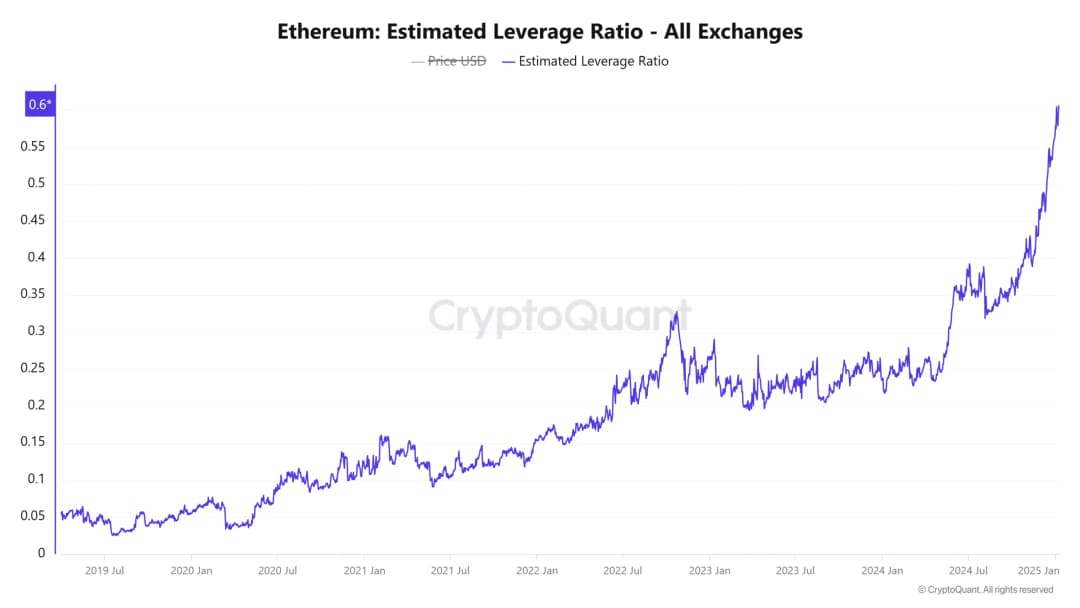 اگر نه خریداران و نه فروشندگان برتری نداشته باشند، ETH میتواند وارد یک محدوده تثبیت شود. با این حال، معاملهگران باید به فشار نزولی که توسط نوارهای هیستوگرام قرمز نوسانگر عالی (AO) نشان داده میشود، توجه داشته باشند. نسبت اهرم تخمینی اتریوم، که میزان ریسکپذیری معاملهگران را اندازهگیری میکند، به ۰.۶۰۵ افزایش یافته و به یک رکورد جدید رسیده است.