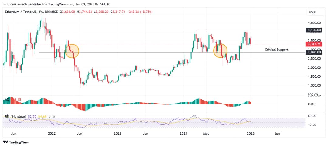 نمودار هفتگی اتریوم نشان میدهد که یک سطح حمایت حیاتی در ۲۸۷۰ دلار وجود دارد. با توجه به روندهای گذشته، نقض این حمایت با کاهشهای قابل توجه قیمت همراه بوده است. اگر فعالیت فروش در میان کمبود تقاضا برای جذب این سکههای فروخته شده ادامه یابد، ETH میتواند به سمت این سطح حمایت کاهش یابد. با این حال، فعالیت فروش هنوز بر فشار خرید غلبه نکرده است. این موضوع در شاخص قدرت نسبی (RSI) که در زمان نگارش این مطلب در سطح ۵۲ قرار دارد، مشاهده میشود که یک سطح نزدیک به خنثی است.