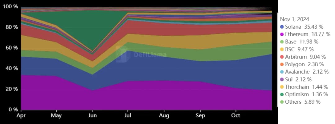 اگرچه سولانا ممکن است از نظر فعالیت لایه پایه اتریوم پیشی گرفته باشد، اما در مقایسه با بلاکچینهای لایه ۲ اتریوم همچنان عقبتر است. سولانا در نوامبر ۳۵.۴٪ از حجم تراکنشهای صرافیهای غیرمتمرکز (DEX) را به خود اختصاص داد که نسبت به اکتبر (۲۷.۲٪) افزایش یافته است. در مقابل، اتریوم و اکوسیستم لایه ۲ آن در نوامبر ۴۵.۲٪ از سهم بازار را در اختیار داشتند که نسبت به اکتبر (۵۰.۱٪) کاهش یافته است.