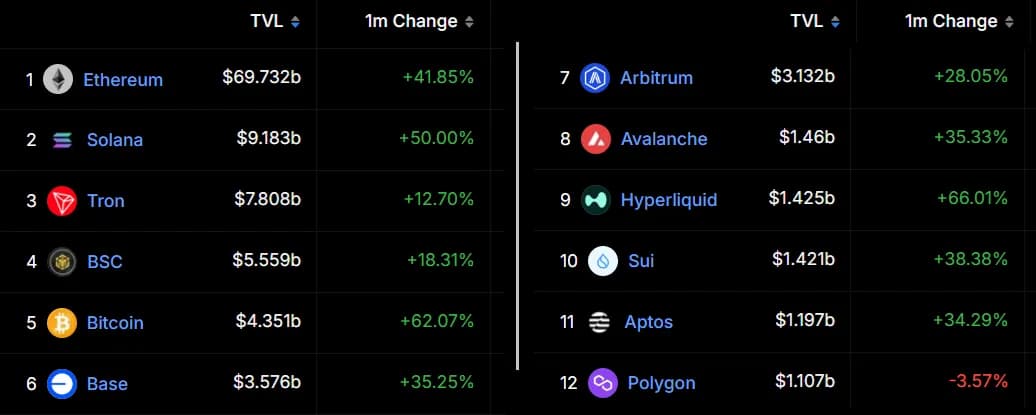 از نظر سپردهها، لایه پایه اتریوم با ۶۹.۷ میلیارد دلار ارزش کل قفل شده (TVL) نسبت به ۹.۲ میلیارد دلار سولانا برتری واضحی دارد. جالبتر اینکه برخی از راهکارهای لایه ۲ اتریوم مانند Base و Arbitrum هر کدام به تنهایی ۳ میلیارد دلار TVL دارند. به طور کلی، اکوسیستم لایه ۲ اتریوم به TVL 11.4 میلیارد دلار رسیده است.