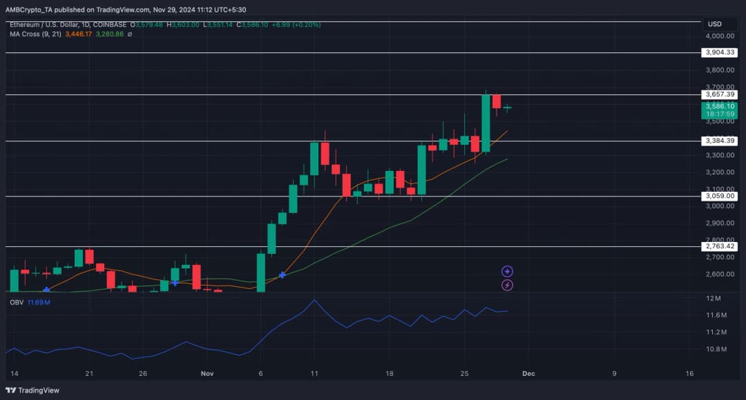 هر دوی این شاخصها به افزایش قیمت بالاتر از مقاومت $3600 اشاره دارند که میتواند نوسانات را افزایش داده و به ETH اجازه دهد در روزهای آینده به $3900 برسد. همانطور که اشاره شد، نمودار روزانه اتریوم نیز نشان میدهد که ETH به طور مداوم در حال آزمایش مقاومت $3600 است. هر زمان که این اتفاق میافتد، نشاندهنده احتمال بالای شکست مقاومت است. این احتمال با شاخص تکنیکال MA Cross نیز تأیید میشود. میانگین متحرک ۹ روزه ETH بالاتر از میانگین متحرک ۲۱ روزه آن قرار دارد که نشاندهنده برتری صعودی در بازار است. علاوه بر این، در حالی که ETH مقاومت خود را آزمایش میکرد، حجم تعادل (OBV) آن بالا باقی ماند.