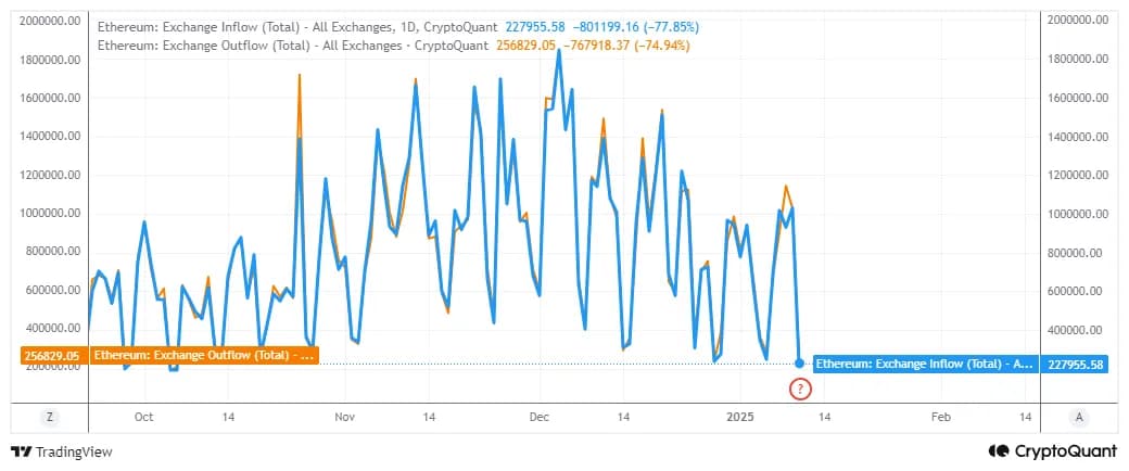 افزایش تقاضای نهنگها میتواند زمینه را برای بازیابی جزئی ETH در آخر هفته فراهم کند. حتی جریانهای صرافی نیز نشان میدهند که این ارز دیجیتال ممکن است در موقعیتی باشد که تقاضا به احتمال زیاد بازگردد. جریانهای صرافی اخیراً به سطوحی کاهش یافتهاند که آخرین بار در اوایل نوامبر مشاهده شده بود. طبق گزارش CryptoQuant، خروجیهای صرافی در زمان نگارش این خبر کمی بیشتر و برابر با ۲۵۶,۸۲۹.۰۵ ETH بود، در حالی که ورودیها ۲۲۷,۹۵۵.۵۸ ETH بود.