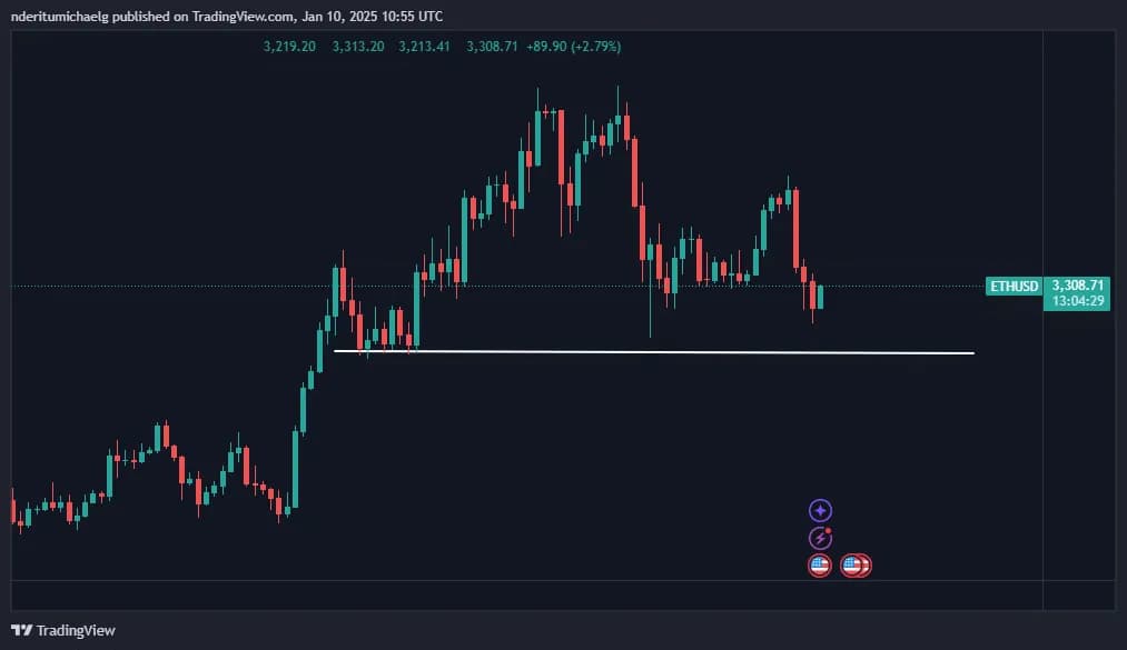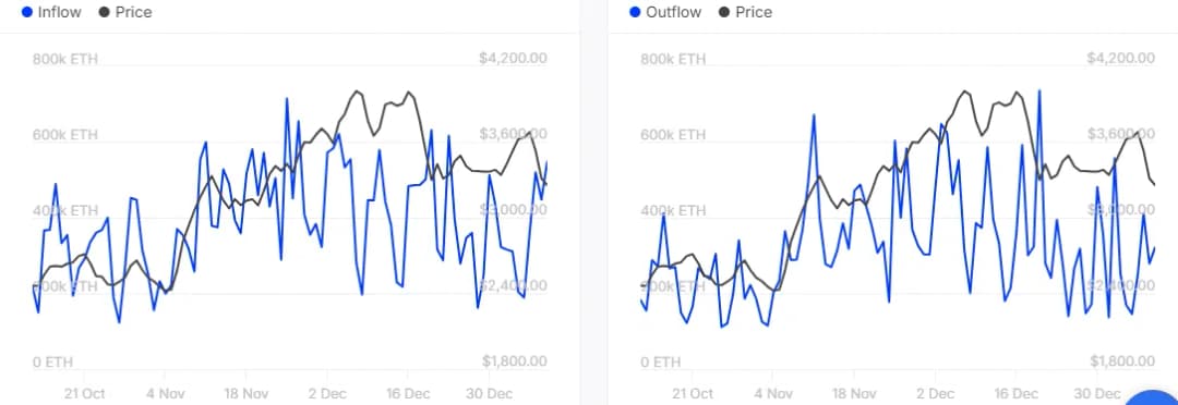 ارزش ETH در زمان نگارش این خبر ۳۳۰۸ دلار بود که به لطف افزایش ۲.۸۹ درصدی در ۱۶ ساعت گذشته به دست آمده است. این بازیابی جزئی نشان میدهد که تقاضا پس از بسته شدن بازار در روز جمعه بازگشته است. بنابراین، پس از کاهش هفتگی، مقداری انباشت صورت گرفته است. با این حال، آیا این ارز دیجیتال میتواند این افزایش را حفظ کند؟ این موضوع به سطح تقاضا و خریداران بستگی دارد. دادههای درون زنجیرهای تأیید میکنند که نهنگها در حال خرید این کاهش قیمت هستند. به عنوان مثال، ورودیهای نهنگها در ۹ ژانویه به ۵۴۷,۲۳۰ ETH رسید، در حالی که خروجیهای نهنگها ۳۲۱,۶۵۰ ETH بود.