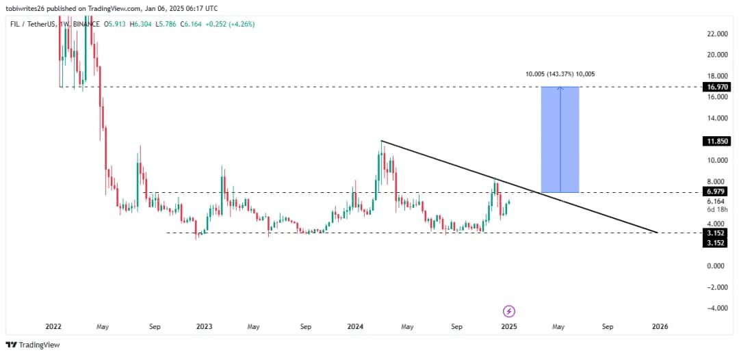 در نمودار هفتگی، FIL نشانههایی از ادامه روند صعودی را نشان میدهد. اگر این شاخصهای صعودی به افزایش خود ادامه دهند و دارایی از سطح مقاومت ۶.۹۷ دلار عبور کند—که مرز بالایی تثبیت یک ساله آن است—FIL میتواند ۱۴۳.۳۷٪ افزایش یابد و به قیمت ۱۶.۷۹ دلار برسد.