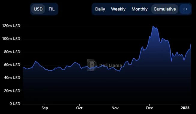 ارزش کل قفل شده (TVL) Filecoin در هفته گذشته افزایش قابل توجهی داشته است و از ۶۷.۱۷ میلیون دلار در ۳۱ دسامبر ۲۰۲۴ به ۹۲.۹۱ میلیون دلار در زمان نگارش این مطلب رسیده است. TVL نشاندهنده مجموع توکنهای سپردهگذاری شده، استیک شده یا قفل شده در پروتکلهای Filecoin است. هنگامی که TVL افزایش قابل توجهی پیدا میکند، معمولاً منجر به حرکت مثبت قیمت برای آن دارایی میشود.