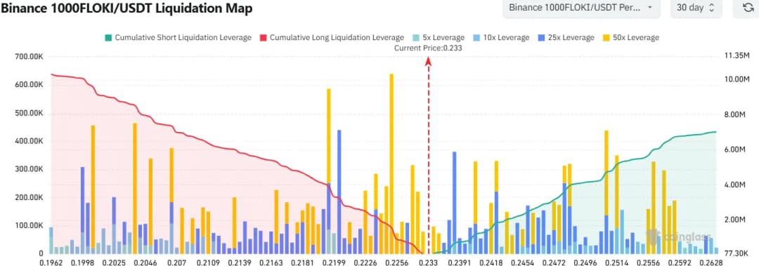نقشه لیکویید شدن FLOKI در بازه یک ماهه، موقعیتهای لیکویید شدن معاملات لانگ و شورت نزدیک را نشان میدهد. سطوح ۰.۰۰۰۲۲۵ و ۰.۰۰۰۲۱۹ به موقعیتهای لانگ با اهرم بالا نزدیک هستند. به طور خاص، سطح ۰.۰۰۰۲۱۹ دارای اهرم لیکویید شدن لانگ نسبتاً بالایی است و میتواند قیمت را به سمت خود جذب کند. در سمت صعودی، اهرم لیکویید شدن شورت کمتر است، اما محدوده ۰.۰۰۰۲۴۸ تا ۰.۰۰۰۲۵ میتواند شاهد یک بازگشت نزولی کوتاهمدت باشد.