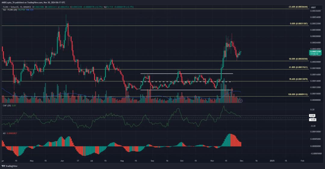 از آگوست تا نوامبر، FLOKI در محدودهای (سفید) بین ۰.۰۰۰۱۱۱ تا ۰.۰۰۰۱۶۵ معامله میشد. نقطه میانی این محدوده با سطح اصلاحی ۷۸.۶٪ در ۰.۰۰۰۱۳۸ همزمان بود. شکست این محدوده در ۱۰ نوامبر با حجم معاملات بالا همراه بود. این صعود تا ۰.۰۰۰۲۹ در ۲۱ نوامبر ادامه یافت، اما از آن زمان کاهش یافته است. این کاهش قیمت با کاهش حجم معاملات و فشار خرید همراه بود. شاخص CMF در بازه زمانی روزانه طی هفته گذشته به طور پیوسته کاهش یافته و در +۰.۰۱ قرار دارد که نشاندهنده جریان سرمایه خنثی است. اسیلاتور Awesome نیز میلههای قرمز را در هیستوگرام خود ثبت کرده که نشاندهنده مومنتوم نزولی در روزهای اخیر است. این موارد با هم، اصلاح قیمت FLOKI پس از افزایش اخیر را نشان میدهند.