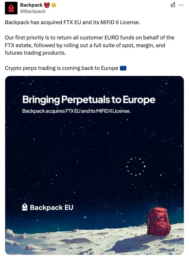 Backpack در اعلامیه خود گفت که این خرید به گسترش حضور آن در اروپا با مجوز MiFID II FTX کمک خواهد کرد. Backpack در سال ۲۰۲۲ توسط توسعهدهنده سولانا، فرانت، تأسیس شد که reportedly ۲۰ میلیون دلار سرمایه از FTX و Jump Crypto برای ساخت صرافی جذب کرد. یکی دیگر از بنیانگذاران Backpack، تریستان یوور، حداقل دو سال با FTX همکاری داشت و در می ۲۰۲۲ از این شرکت جدا شد. در طول فروپاشی FTX در سال ۲۰۲۲، Backpack ۱۴.۵ میلیون دلار یا ۸۸٪ از بودجه عملیاتی خود را از دست داد. این شرکت از آن زمان با حداقل بودجه به فعالیت خود ادامه داده است.