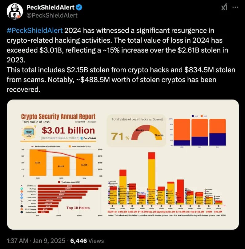 شرکت امنیت بلاکچین PeckShield گزارش داد که هکرها و کلاهبرداران در سال ۲۰۲۴ بیش از ۳ میلیارد دلار از فعالیتهای مرتبط با کریپتو سرقت کردهاند که افزایش قابل توجهی نسبت به سال قبل دارد. در یک پست شبکه اجتماعی X در ۹ ژانویه، PeckShield دادههای گزارش ۲۰۲۴ خود را بازنشر کرد که نشان میداد هکرها و کلاهبرداران کریپتو ۴۰۰ میلیون دلار بیشتر از سال ۲۰۲۳ سرقت کردهاند که حدود ۱۵٪ افزایش را نشان میدهد. با این حال، دادههای PeckShield نشان داد که تعداد کلی هکها و کلاهبرداریها از سال ۲۰۲۲ در حال کاهش بوده و در پایان ۲۰۲۴ به حداقل رسیده است.