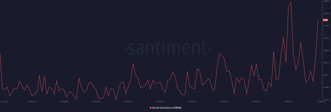 تسلط اجتماعی HBAR به طور چشمگیری از 1٪ به 1.5٪ افزایش یافته است که نشاندهنده افزایش علاقه در پلتفرمهای رسانههای اجتماعی است. این افزایش در اشارهها یک سیگنال مثبت است، زیرا تسلط اجتماعی بالاتر اغلب منجر به افزایش حجم معاملات و حرکت قیمت میشود. افزایش مشارکت جامعه نشان میدهد که هدرا در میان سرمایهگذاران خرد و معاملهگران در حال جلب توجه است. این موضوع میتواند حرکت قیمت آن را در کوتاهمدت بیشتر تقویت کند.