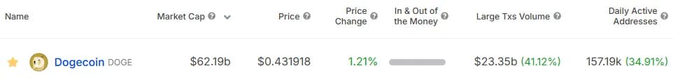 علاوه بر تحلیل تکنیکال، به نظر میرسد نهنگها و معاملهگران به شدت در این میم کوین مشارکت دارند، همانطور که توسط شرکتهای تحلیل زنجیرهای مانند IntoTheBlock و Coinglass گزارش شده است. تا ۳۰ نوامبر، حجم تراکنشهای بزرگ توسط نهنگها ۴۱ درصد افزایش یافته بود که نشاندهنده باور و اطمینان آنها به این میم کوین است.