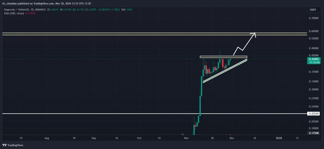 پس از یک افزایش قابل توجه ۱۵۰ درصدی، DOGE در دو هفته گذشته وارد یک منطقه تثبیت شده است. با این حال، این تثبیت به نظر میرسد که در نمودارها در حال تشکیل یک الگوی مثلث صعودی است، همانطور که در تحلیل تکنیکال AMBCrypto اشاره شده است.
