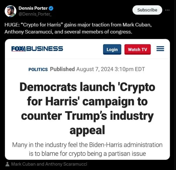 پستهای رسانههای اجتماعی که کمپین «کریپتو برای هریس» را به اشتراک میگذاشتند نیز بحثبرانگیز بودند. حامیان ترامپ نظرات منفی در این پستها ابراز کردند که نشاندهنده تداوم اختلاف بین اعضای جمهوریخواه و دموکرات جامعه کریپتو است.