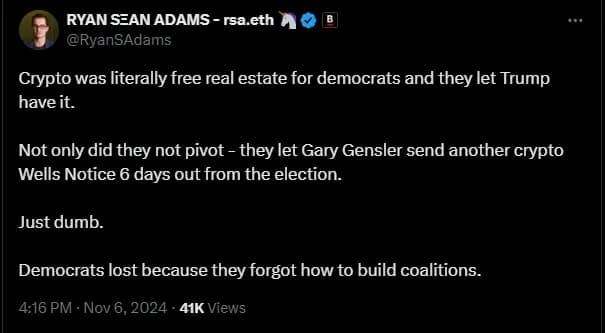 این بحثها بهویژه در پلتفرمهای رسانههای اجتماعی مانند X در طول دوره انتخابات مشهود بود. به عنوان مثال، چندین اینفلوئنسر رسانههای اجتماعی توییت کردند که حزب دموکرات به دلیل سیاست «ضد کریپتو» انتخابات را باخته است. بسیاری از این توییتها با واکنشهای خشمگین دموکراتهای حامی کریپتو مواجه شد.