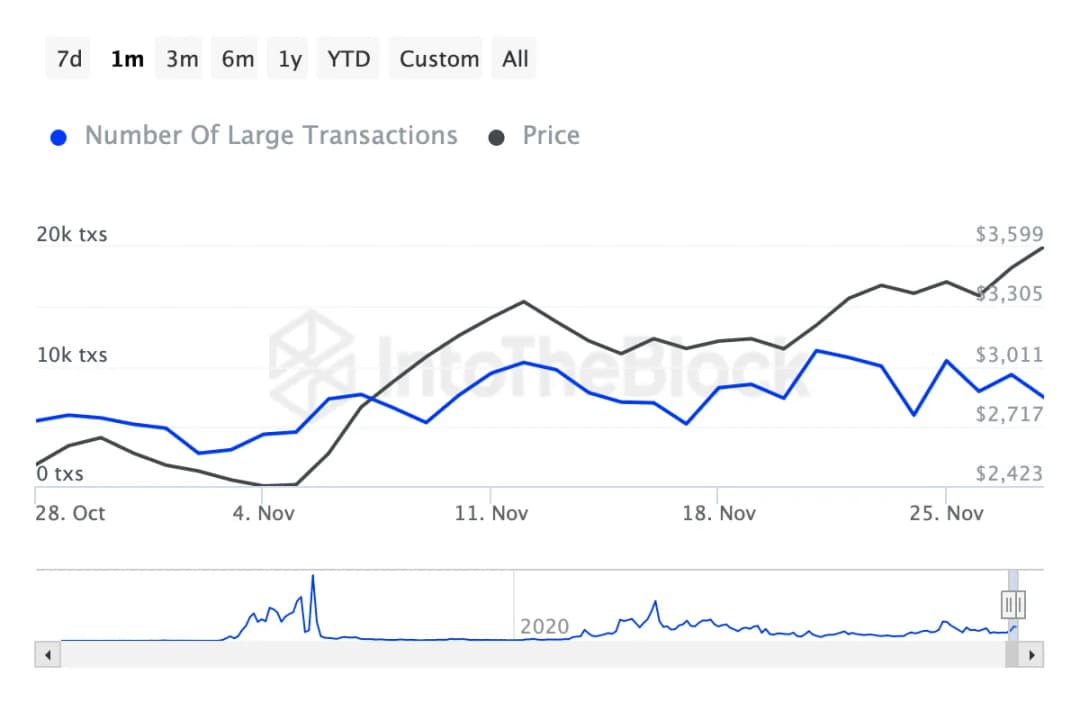 یکی دیگر از شاخصهای مهم، فعالیت نهنگهای اتریوم (سرمایهگذارانی که تراکنشهای بالای ۱۰۰ هزار دلار انجام میدهند) است. دادههای IntoTheBlock نشان میدهد که تعداد تراکنشهای نهنگها در اوایل این ماه به اوج ۱۱,۲۱۰ رسید که نشاندهنده افزایش فعالیت نهادی است. با این حال، این رقم اخیراً کاهش یافته و اتریوم تا ۲۸ نوامبر ۷,۴۱۰ تراکنش نهنگ را ثبت کرده است.