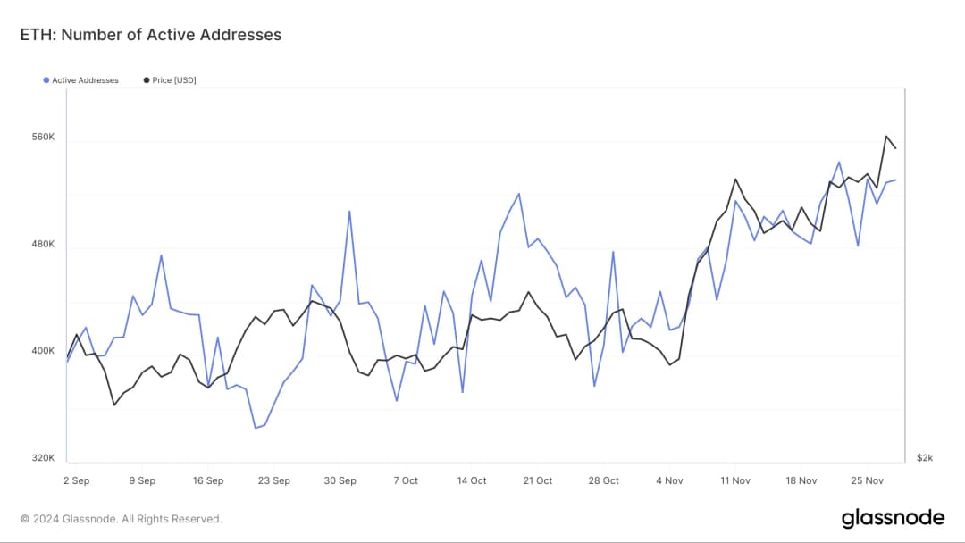 بررسی شاخصهای کلی اتریوم، بینشهای بیشتری از عملکرد این دارایی و رفتار سرمایهگذاران ارائه میدهد. یکی از شاخصهای قابل توجه، رشد آدرسهای فعال اتریوم است که اغلب با علاقه سرمایهگذاران خرد مرتبط است. طبق دادههای Glassnode، تعداد آدرسهای فعال اتریوم از کمتر از ۵۰۰ هزار در اکتبر به ۵۳۱ هزار در ۲۸ نوامبر افزایش یافته است.
