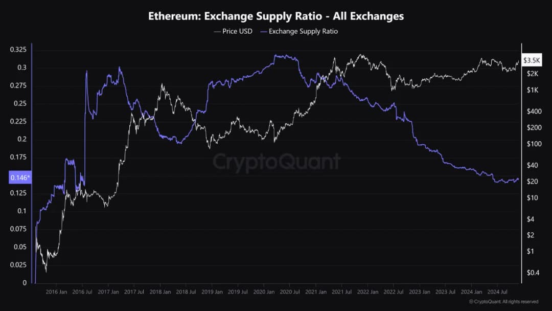 این تحلیلگر تأکید کرد که با وجود قیمتهای پایینتر اتریوم نسبت به اوجهای قبلی، نسبت عرضه اتریوم در صرافیها به سطوحی کاهش یافته که آخرین بار در سال ۲۰۱۶ مشاهده شده بود. این کاهش نشان میدهد که سرمایهگذاران داراییهای خود را از صرافیها خارج میکنند که نشاندهنده انباشت بلندمدت است. حتی با افزایش عرضه در گردش، کاهش ETH نگهداری شده در صرافیها نشان میدهد که سرمایهگذاران همچنان ETH را به عنوان یک دارایی امن میبینند.