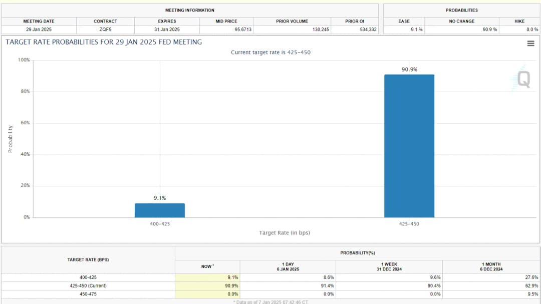 آخرین برآوردها نشان میدهد که احتمال کاهش ۰.۲۵٪ نرخ بهره ۹.۱٪ و احتمال حفظ نرخ فعلی ۹۰.۹٪ است. در حالی که بیت کوین توانست به بالای ۱۰۰ هزار دلار بازگردد، حفظ این افزایش به شدت به تحولات مقررات کریپتو بستگی دارد. بایننس ریسرچ به Cointelegraph گفت: «حفظ این سطوح در بلندمدت به عوامل مختلفی از جمله اجرای واقعی مقررات کریپتو و مسیر سیاست فدرال رزرو در سال ۲۰۲۵ بستگی دارد.»