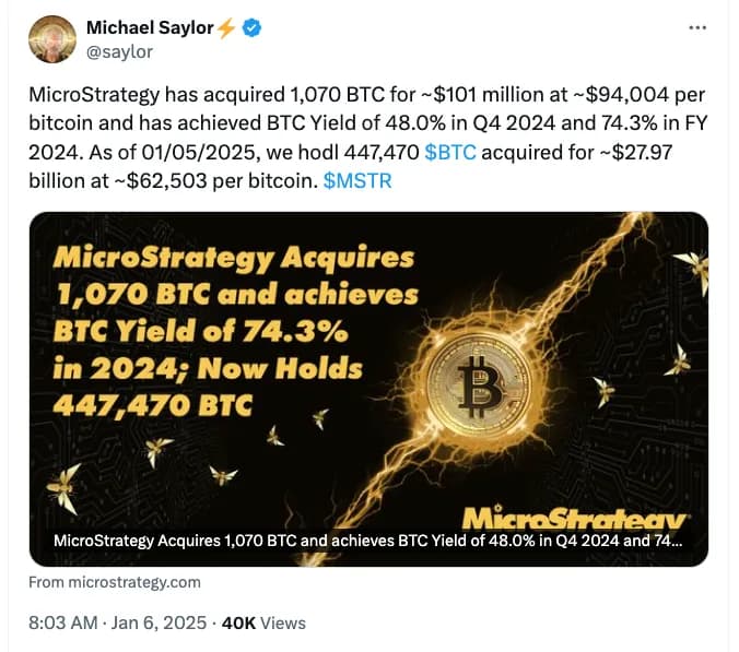 MicroStrategy، یکی از بزرگترین دارندگان شرکتی بیت کوین، از خرید ۱۰۷۰ بیت کوین جدید در دو روز پایانی سال ۲۰۲۴ خبر داده است. این شرکت در ۶ ژانویه اعلام کرد که بین ۳۰ تا ۳۱ دسامبر ۲۰۲۴، حدود ۱۰۱ میلیون دلار نقدی برای این خرید هزینه کرده است. طبق پروندهای که به کمیسیون بورس و اوراق بهادار ایالات متحده ارائه شده، این خرید با قیمت متوسط حدود ۹۴,۰۰۴ دلار به ازای هر بیت کوین انجام شده است. طبق فرم 8-K فعلی این شرکت، MicroStrategy از ۳۱ دسامبر خرید بیت کوین اضافی انجام نداده است.