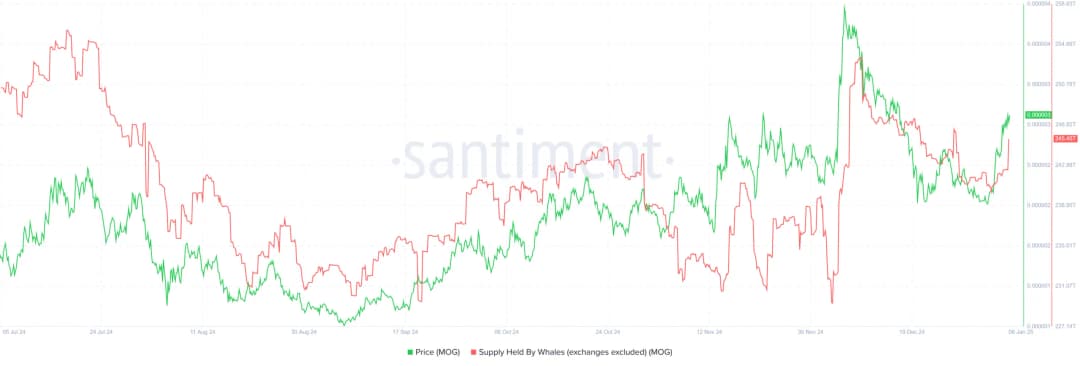 علاوه بر این، تقاضا برای این میم کوین در میان نهنگها بیشتر دیده میشود. به این ترتیب، عرضه نگهداری شده توسط نهنگها در ۲۴ ساعت از ۲۴۲.۴ تریلیون به ۲۴۵.۶۹ تریلیون افزایش یافته است. این نشان میدهد که نهنگها در یک روز ۳.۲۹ تریلیون توکن MOG خریداری کردهاند. هنگامی که نهنگها به انباشت گسترده روی میآورند، نشاندهنده دیدگاه صعودی آنها و انتظار افزایش بیشتر قیمتها است.