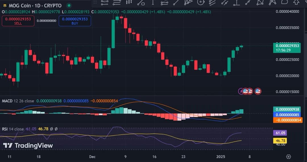 از زمانی که Mog Coin (MOG) به کف محلی $0.0000019 رسید، شاهد یک روند صعودی قوی بوده و به اوج محلی $0.00000297 دست یافته است. در زمان نگارش این مطلب، MOG با قیمت $0.00000294 معامله میشود که نشاندهنده افزایش ۳۶.۳۹ درصدی در نمودارهای هفتگی است. این آلتکوین همچنین در نمودارهای روزانه ۸.۷۸ درصد افزایش داشته است. قبل از این افزایش قیمت، MOG در یک روند نزولی قرار داشت و در نمودارهای ماهانه ۲۶.۴۶ درصد کاهش یافته بود. با این افزایش هفتگی، این سوال مطرح میشود که آیا این میم کوین میتواند روند صعودی را حفظ کند.