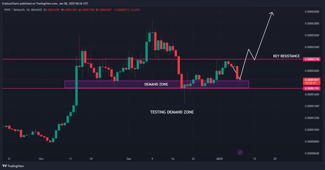حرکت قیمتی PEPE در یک نقطه حساس قرار دارد. در حال حاضر، این توکن در حال آزمایش سطوح حمایت کلیدی است و نزدیک منطقه تقاضا در حدود ۰.۰۰۰۰۱۷۰۱ دلار قرار دارد. اگر قیمت این سطح را حفظ کند، میتواند شاهد بازگشت به سمت سطح مقاومت کلیدی در ۰.۰۰۰۰۲۱۹۶ دلار باشد. با این حال، اگر فشار فروش افزایش یابد، PEPE ممکن است با کاهش قیمت مواجه شود. بنابراین، حفظ کنترل خریداران برای جلوگیری از کاهش بیشتر و اجازه به حرکت صعودی بسیار مهم است.
