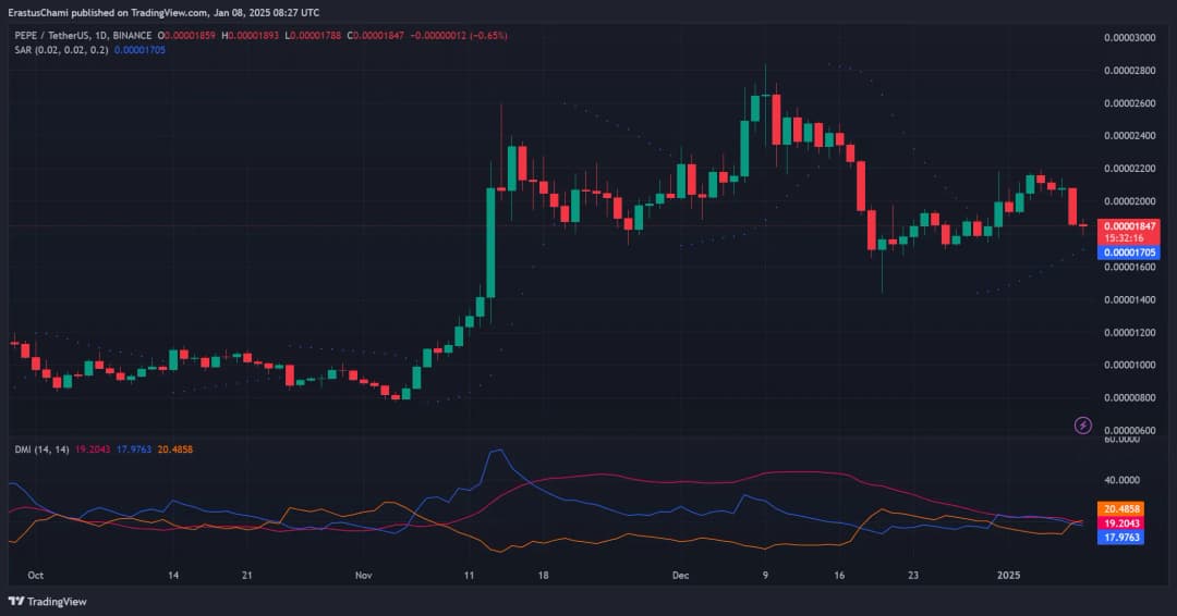 اندیکاتور پارابولیک SAR نشان میدهد که قیمت بالاتر از خطوط نقطهچین است که نشاندهنده مومنتوم صعودی است. PEPE با قیمت ۰.۰۰۰۰۱۷۰۵ دلار معامله میشود که مومنتوم مثبت را نشان میدهد. شاخص جهتدار (DMI) نشان میدهد که +D در ۱۷.۸۷۶، -D در ۲۰.۴۸۵ و ADX در ۱۹.۲۰ قرار دارد. این ارقام نشان میدهد که خرسها هنوز کنترل دارند، اما قدرت روند ضعیف است. اگر خریداران فشار را افزایش دهند، مومنتوم میتواند تغییر کند و گاوها کنترل را به دست بگیرند.